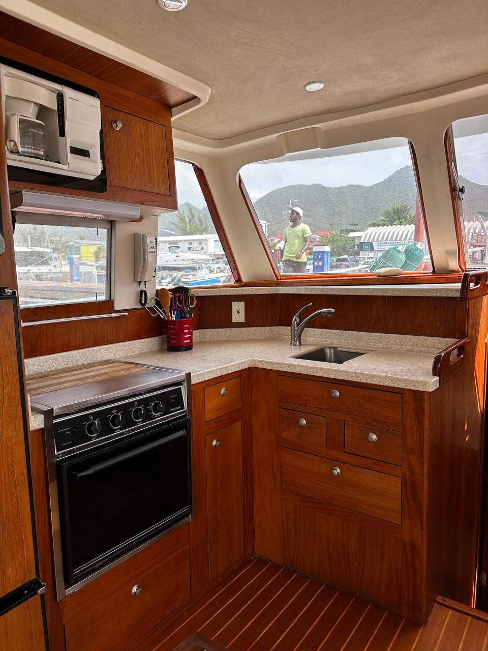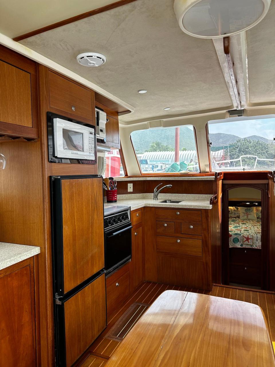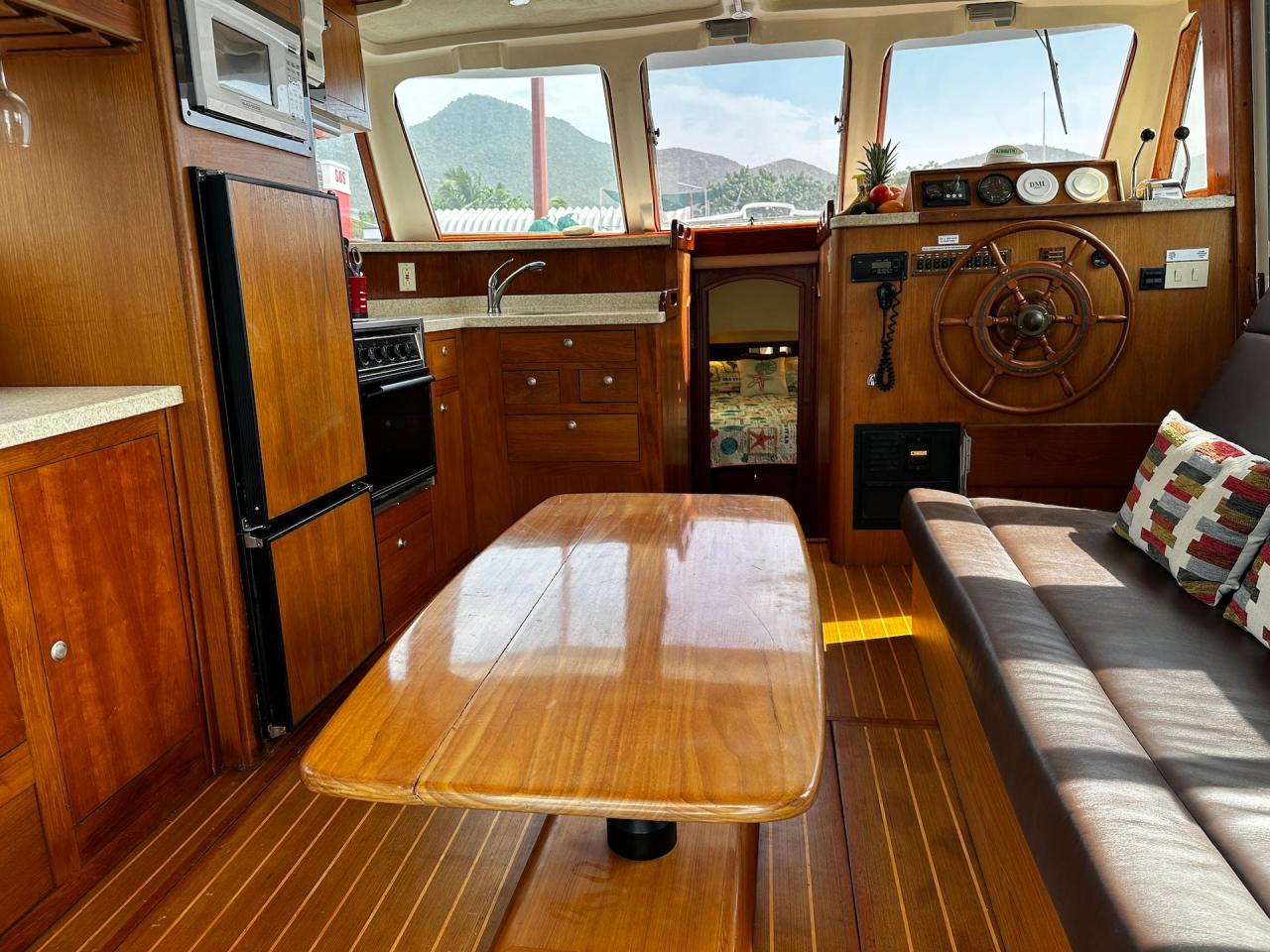 The Mainship 390 is more than just a trawler—it’s the perfect liveaboard and vacation boat, offering multiple comfortable areas to relax on deck and the flybridge. Its spacious and elegant interior, crafted from warm teak, creates a welcoming atmosphere. The salon features a fully equipped lower helm with a panoramic view, ensuring excellent visibility and comfort while cruising.