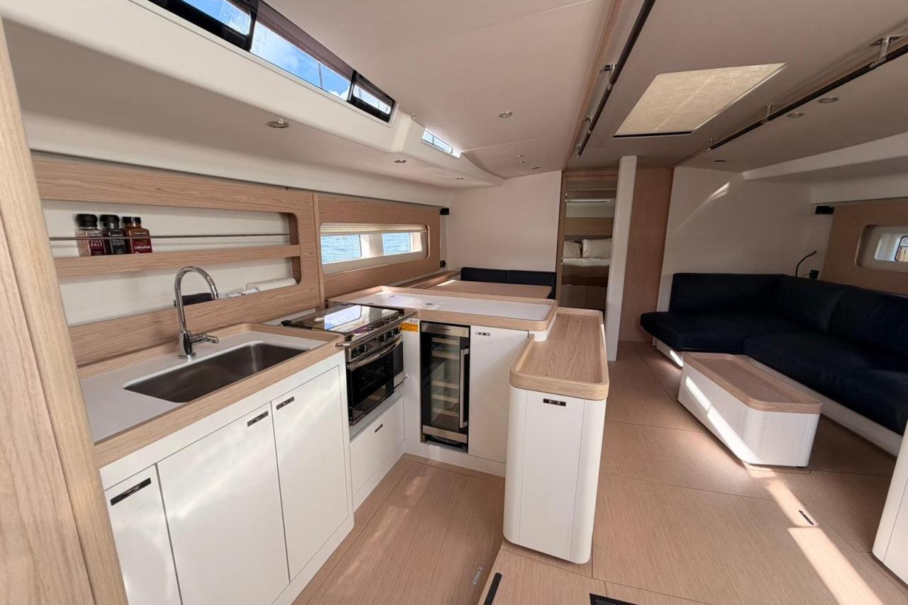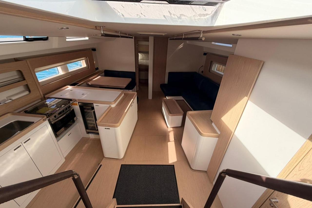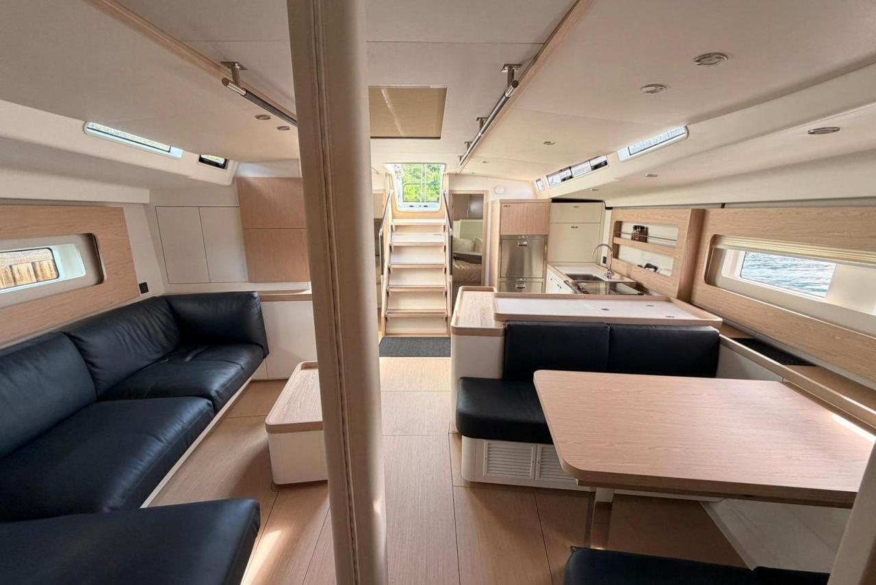 Powered by a 110 HP Yanmar diesel, equipped with retractable stern thruster, generator, air conditioning, and a full Garmin navigation suite, she is perfectly suited for fast passagemaking as well as relaxed coastal cruising. The Fastnet Pack, self-tacking jib, and downwind sailing package ensure easy handling with a reduced crew, while the North Sails inventory (2024) delivers exceptional performance.